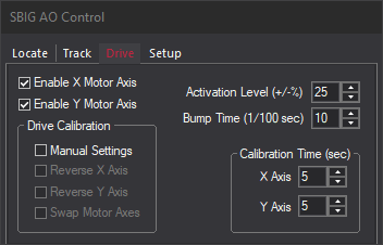 The Drive tab is used to set up the motor drive for autoguider operation. Unlike normal autoguiders, the AO tip/tilt optic will be doing most of the corrections while autoguiding. The motor drive will only be activated occasionally. This means that the exact calibration speed is unimportant; only the directions must be set correctly.