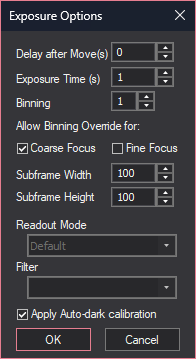 Once you are done, click OK to return to the Focus Tab, then click Exposure. Set Delay after Move to 0, Exposure Time to 1 second, Binning to 1, Subframe Width and Subframe Height to 100. If your camera has multiple options for Readout Mode you can select that here. If your camera has a shutter turn on Apply Auto-dark calibration. Click OK.