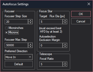 You also need to set the Target 1/2 Flux Dia. The Half Flux Diameter is a measure of how large the star images are, in pixels; obviously we want them to be as small as possible. The target needs to be set somewhat higher than the optimum; typically by 2 pixels. This is required because the measurements are made on either side of focus, not right at focus. Typical values are 5 to 7, but it depends on how small your star images are at best focus.