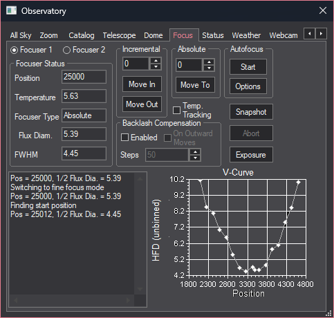 Watch the log and the V-Curve. During fine focus, the Half Flux measurement should change about 1.5 pixels every time the focuser moves (anywhere between 1 and 1.5 is okay). If it moves too quickly, open the Options and increase the Focuser Step Size. If it moves too slowly, decrease the Focuser Step Size. This will provide optimum focus speed and accuracy.