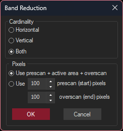 Some cameras have the option of providing overscan pixels to the left and/or right of the image. Often this requires making an adjustment to the camera settings to activate these extra pixels. These pixels are not exposed to light and can be used for the banding correction. In this case, you can select Use 0 prescan (left) pixels and 0 overscan (right) pixels. When selected, the number of either left or right pixels must be non-zero.