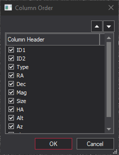 The Options menu allows you to select the epoch of the displayed results: select either RA/Dec in JNow or RA/Dec in J2000. You can also select Arrange Results Columns to choose which information columns appear and in what order. Turn off the check box to disable the display. Click on an ID and click the up or down arrows to move it to the desired position in the list.