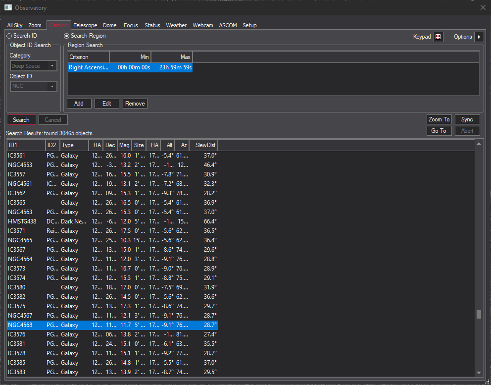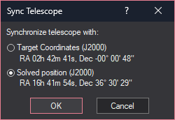 Once you have your search list, you can click the Zoom To button to see it in the Zoom Tab. You can click the Go To button to slew the telescope to the object. If the telescope is slewing you can click Abort to stop the slew. You can also click Sync to synchronize the telescope position readout to the object. When you click Sync you are also given the opportunity to sync to a PinPoint solved position for the currently selected image.