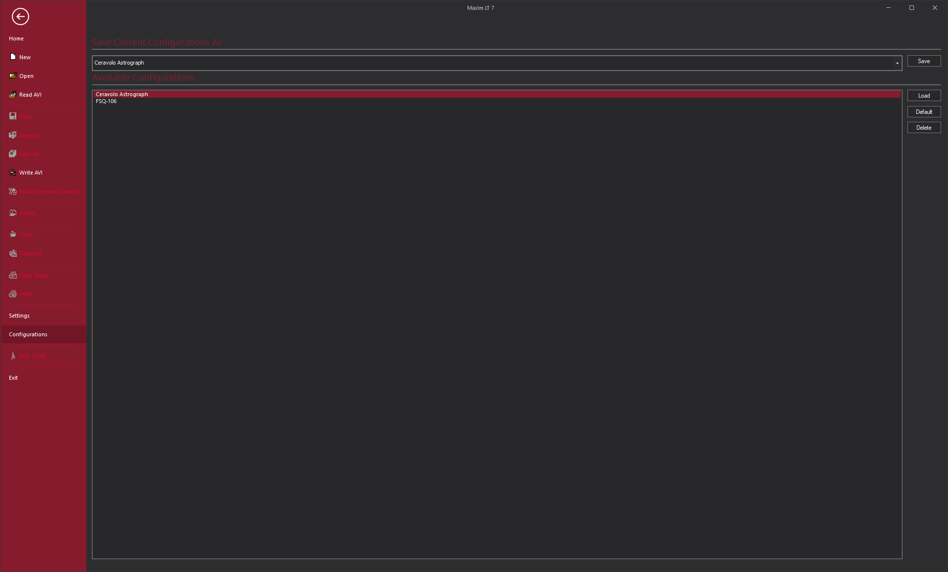 Once you have made your desired changes to MaxIm DL settings, run the Configurations command and enter a name in the Save current configurations as text box, and then click the Save button. Your saved configuration will then appear in the Available configurations text box.