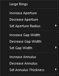 Ring Cursor Controls - The ring cursor is displayed whenever the Information Panel is displayed. Large Rings selects the range, normal or double-sized. To adjust the inner circle, use Increase Aperture, Decrease Aperture, or the Set Aperture Radius sub-menu. To adjust the gap width between the aperture and the outer background measurement annulus, use Increase Gap Width, Decrease Gap Width, or the Set Gap Width sub-menu. Finally, to adjust the outer background measurement annulus, use Increase Annulus, Decrease Annulus, or the Set Annulus Thickness sub-menu.