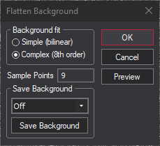 You must place at least four samples before background flattening can occur. With fewer samples, attempts to update the Preview Image and/or the Full Screen preview are ignored, and clicking OK displays the error message "You must select at least 4 background points". For Simple (bilinear) mode, locations near the corners of the image are recommended. In Complex (8th order) mode, you will typically need eight or more points, more or less uniformly distributed. Good results can often be obtained by operating with Auto Full Screen preview enabled, and adding new samples in the lightest and darkest areas of the interim image. For critical work, you should set the Screen Stretch to High or to Manual with the Minimum and Maximum settings close together so as to exaggerate contrast.