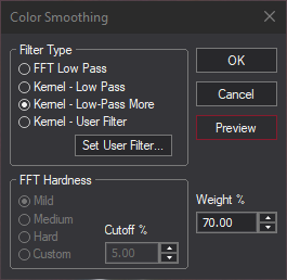 The Filter Type options work identically to those in the FFT Filter and Kernel Filter commands. The Set User Filter button also works identically to the control of the same name in the Kernel Filter dialog.