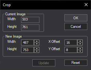 Alternatively, you can enter new values, in pixels, for Width, Height, X Offset, and Y Offset. To see the area selected in the image window, click Update. When Update is clicked, the values are checked, and if they exceed the image dimensions they will be automatically readjusted. Click OK to crop the image.