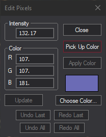 The paint color may be determined in four different ways. A monochrome value may be entered manually by typing a value into the Intensity field and pressing Enter or clicking Update. For Color images red, green and blue values may be entered in the same fashion. Alternatively a value may be picked up from the image using the Pick Up Color mode. When selected, the user clicks on a pixel whose value is to be used for painting. A color may also be selected from a palette using the Choose Color button.