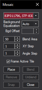 Once you have created your blank image, run the Mosaic command. A small toolbox will appear in the top left corner of the MaxIm DL window. Select your first image (referred to as a "tile" of the mosaic) using the list at the top of the toolbox and click Place. The selected image will appear in the mosaic image. Click on the image, hold down the button, and drag the image to a suitable location in the mosaic buffer. When you are happy with the position of the image, click the Blend button to lock it in place.