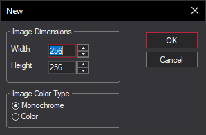 The desired image Width and Height and Color Type must be selected. Width and height are measured in pixels. Upon clicking OK, a blank image of the appropriate size will be created. All pixels in the image will be zero. The image contents can be modified using any of the image editing or processing commands.