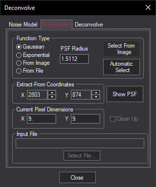 You can obtain the Point Spread Function from any open image, although normally you will want to take it from the image you are about to deconvolve. To capture it from a different one, click on the title bar or image tab of the desired image before clicking Automatic Select or Select from Image.