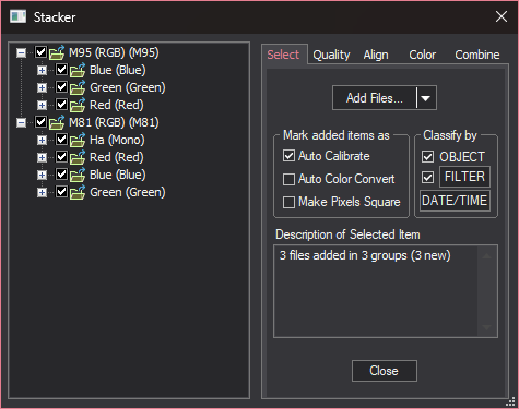 The Stacker provides a great deal of automation to the process of stacking images. It can automatically sort your images into groups by object name and filter, calibrate and/or color convert (de-Bayer), select images based on their quality, align them, stack them, and color combine LRGB image sets to produce a final image, ready for processing.