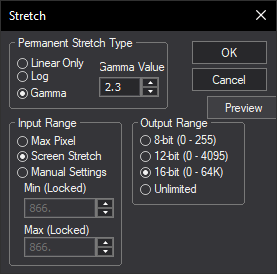 The Input Range can be set to Screen Stretch, which in Linear Mode produces an output matching the current screen appearance. This is useful in producing final images for output to 8-bit image formats which have limited range. Note that the minimum and maximum values are always taken from the Screen Stretch settings for the original image. These can be adjusted dynamically using, for example, Quick Stretch. However, when a Full Screen Preview is present, these values are locked because the Screen Stretch Panel is controlling how the resulting image is displayed. To adjust Min and Max in this mode, you must cancel Full Screen Preview first. The Max Pixel selection sets the input range from 0 to the brightest pixel in the image. This prevents any image pixels from being saturated in the final result, but may produce images with low contrast. You can also manually set values in a similar fashion to the Screen Stretch Panel.