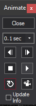 button at the bottom left is depressed, play "loops", that is, cycles back to the first image after the last image has been displayed. If it is unchecked, animation stops after the last image has been displayed. Looping has no effect on the operation of the step forwards and backwards buttons.