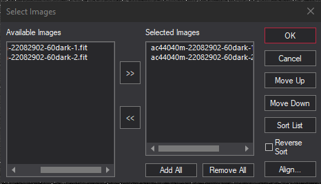 When more than two images are selected, the order may be important. The images may be sorted alphanumerically by name using the Sort List button. The direction of sort is increasing downward unless the Reverse Sort check box is selected, in which case the sort is decreasing downward.