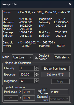 Magnitude Calibration sets up the Magnitude display on the Information Panel. You need to enter the Intensity and known Magnitude of a star on the image, as well as the Exposure time used for the image. Once these values are known, the magnitude calibration will be accurate for any image taken with the same camera (note: some cameras have multiple modes which may affect this).