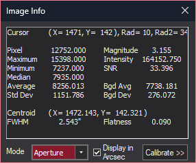 Aperture mode shows statistics on the area under the circular cursor as the mouse is moved around the image. The current Cursor position and inner and outer radii are shown at the top. The Pixel value directly under the cursor is also shown.
