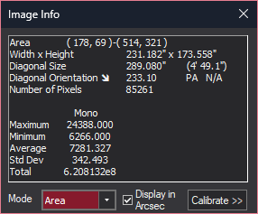 The Area is shown as the coordinates of the corners of the box, and Width x Height is shown. The Diagonal size of the box is shown, which allows you to measure distances on the frame. The Diagonal Orientation is shown graphically as an arrow and numerically in degrees; this indicates which way the mouse was dragged. If an astrometric solution is available, the Position Angle (PA) is shown (relative to true North). The total Number of Pixels included in the box is also displayed.