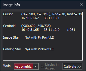For users with the full version of PinPoint, extra information is available after you perform a PinPoint analysis on an open image. Image Star provides the position and magnitude of the star within the aperture (that closest to the center is used if there is more than one) as determined by PinPoint. Catalog Star provides information on stars that were identified in the catalog used during analysis. This includes the identity of the star, the position, and magnitude as provided by the catalog. The table of the catalog and image stars detected in the image, which is used to display Image Star and Catalog Star information as you probe the image with the circular cursor, is not recorded when an image is saved to disk. This information is therefore not available when an image is loaded unless you re-solve the image using PinPoint Astrometry.