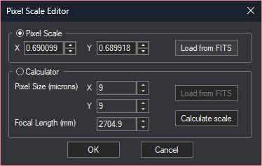If the pixel scale is already in the FITS header, just select Pixel Scale and click Load from FITS. Alternatively, you can also enter values manually in the X and Y fields in this mode. The scale is in arc-seconds per pixel.