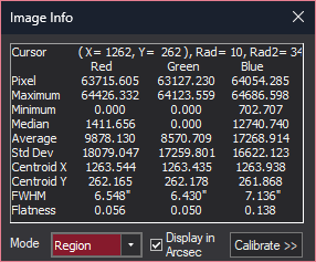 The Centroid is calculated within the inner aperture. It is an indication of the ”center of gravity” of the star image, and is calculated to a fraction of a pixel. The full-width half maximum or FWHM is also calculated. This is a measurement of the diameter of the star image at ½ of the maximum intensity. It is calculated by fitting a Gaussian shape to the star. The Flatness is an indication of how out-of-round the star image is. A flatness of zero is perfectly circular, while a flatness of 0.1 indicates that the star is longer in one dimension than the other by 10%.