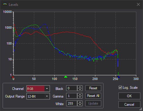 The graphical histogram display shows all three channels for color images. If Log. Scale is selected then the vertical axis is shown logarithmically. That compresses the dynamic range so you can better see the information being presented (the Screen Stretch Panel also uses a logarithmic display). Otherwise it shows a linear scale. The graph can be resized by grabbing the "gripper" on the bottom right corner of the dialog box and moving it.