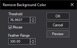 The Remove Background Color command converts pixels below a specified Threshold to monochrome. The color of pixels greater than this but not exceeding the sum of Threshold plus Feather Range is partially removed; pixels brighter still are left untouched.