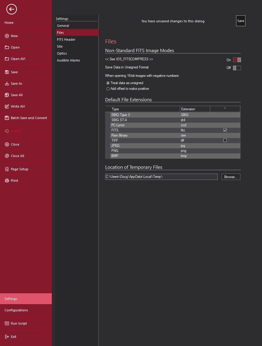 Save Data in Unsigned Format will cause 16-bit integers to be written to FITS files as unsigned numbers. Normally BZERO and BSCALE are written to the file to offset the data values.