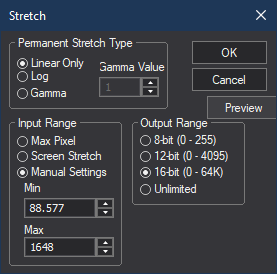 - Perhaps this setting is a bit harsh. We can better control the amount of dynamic range compression by changing the Permanent Stretch Type to Gamma. Set Gamma Value to 0.3 and click Preview.