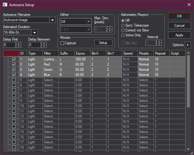 We can now proceed to more advanced camera control operations, namely setting up an LRGB color autosave sequence. This assumes you have set up a filter wheel (or simulator) with the necessary filter slots.