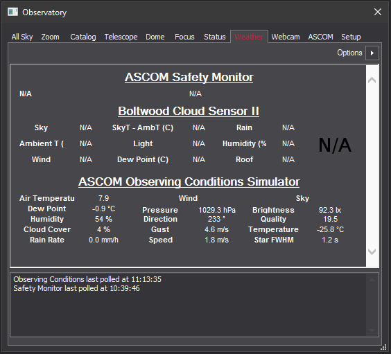 The Weather Tab shows information from a Davis Weather Station, a Boltwood Cloud Sensor and any device that supplies an ASCOM Observing Conditions driver. Relevant information is also stored in the FITS header of any images that are acquired while the equipment is being monitored.