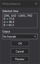 White Balance transforms an image by generating a set of scale factors that will equalize the color values in the Selected Area, so that the selected color is changed to white. The scale factors are then adjusted according to the selected Output type. If No Rescale is chosen, then the scale factors are set so that the Selected Area has the same intensity after the White Balance operation. If Output is set to 8-Bit, the scale factors are set so that the output intensity of the Selected Area is 255. If Output is set to 16-Bit, then the scale factors are set so that the Selected Area's output intensity is 65536.