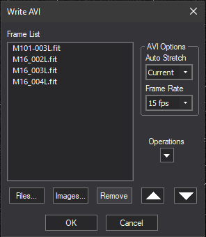 The two AVI Options control aspects of the resulting video file. Auto Stretch controls how images or files having a maximum pixel value of more than 255 are converted to the limited range available in AVI files. Current uses the stretch setting associated with each image, or what would be applied automatically if a file were loaded into MaxIm DL; use this setting if you have already "tuned" each frame's brightness and contrast for uniformity. The remaining settings are as described in the Screen Stretch Panel, except that Manual mode obtains the minimum and maximum values from the image that had the focus when the Write AVI command was started, even if this image is not included in the output. This mode is not available if no images are open in MaxIm DL. Frame rate lets you specify the rate at which images will be presented in the resulting video file, with settings from 1 to 30 frames per second.