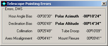The Telescope Pointing Errors box displays the primary error terms in Degrees, Minutes, Seconds format. The meaning of the various terms is as follows: