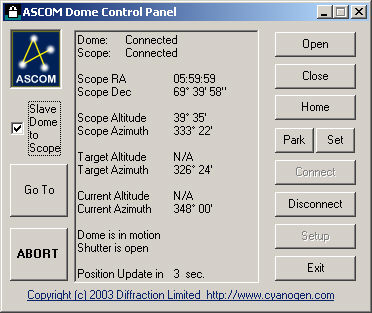 Click the Connect button. The dome and telescope should now be connected. If you get an error message, check the connections.