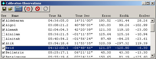 Each alignment point is listed. If the alignment was based on a star, the star Name will be displayed. If Auto-Calibration was used, the name will be the date and time of the observation. The True RA and True Dec positions are displayed, as well as the measured residual Error in arc-minutes. The residual error shows how much error remains after the MaxPoint correction is made. You can also see separate ErrRA and ErrDec values (tip: these can be hidden if desired by resizing the window.)
