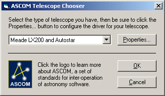 Select the desired telescope, and then click Properties... to configure it. When you are done click OK.