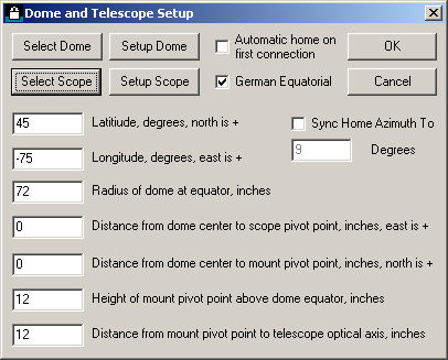 Getting the mount/dome parameters correct is critical for proper slaving. It can be very difficult to tell which number is wrong if an error is made. If you find the telescope does not reliably align with the dome when Slave to Telescope is checked in the main control panel window, double-check everything, including the following: